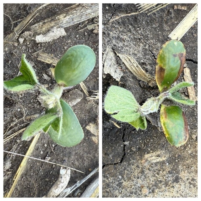 If you had soybeans treated with Ilevo for SDS and SCN this year, you may be noticing some “halo effect”. This is when the fungicide is taken into the seed, and shows some burn-like symptoms on the cotyledons and young roots. Saltro seed treatment doesn’t affect beans like that. You can see the comparison in the picture with Saltro on the left and llevo on the right .. Sometimes Authority or Valor herbicides applied pre emerge can make this llevo “burn” worse.